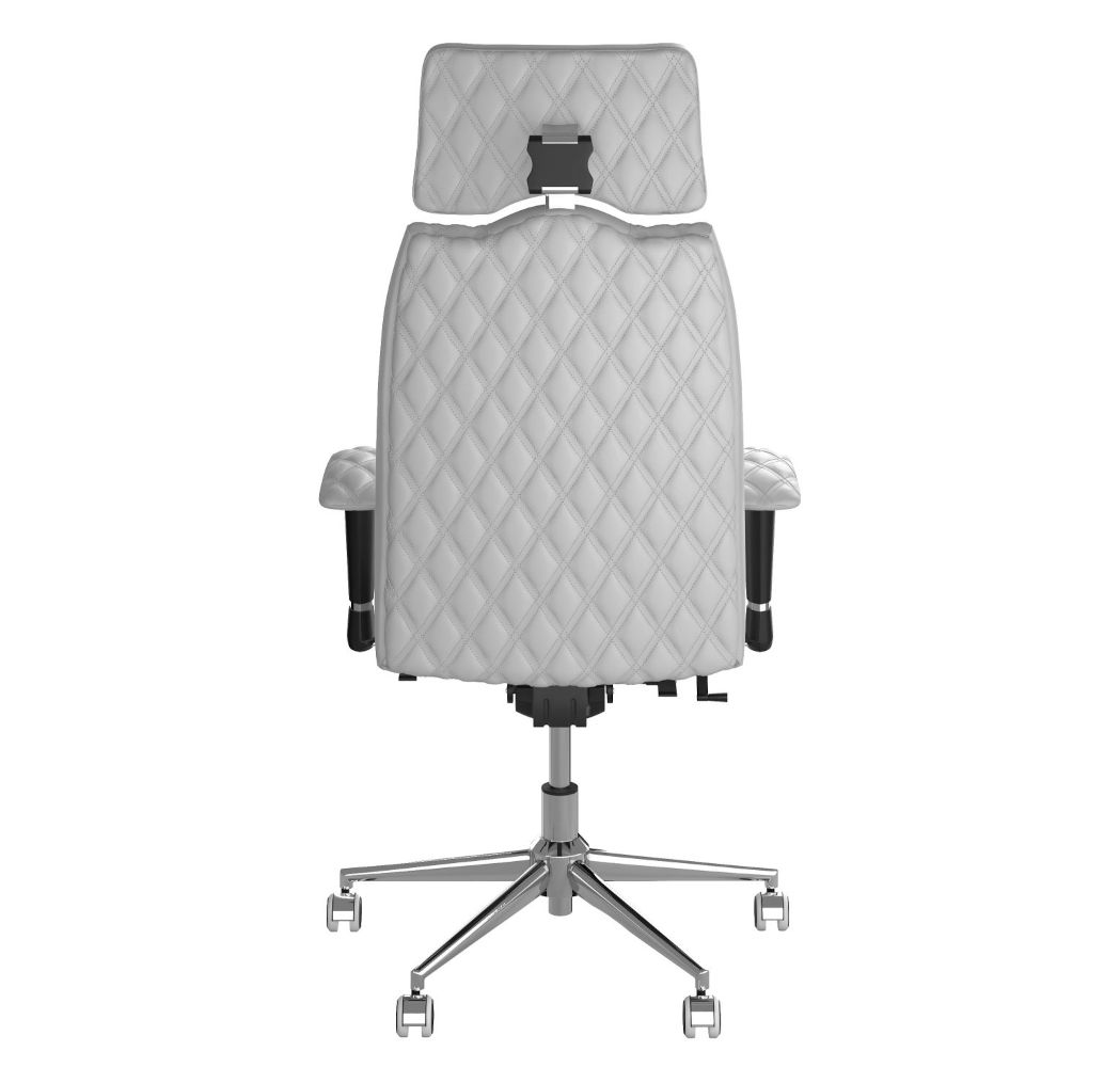 Tapicerka z ekologicznej skóry oraz precyzyjnie ręcznie szyte detale podkreślają elegancję i profesjonalny charakter krzesła. Ergonomiczne wsparcie lędźwiowe i regulowany zagłówek zapewniają właściwą pozycję kręgosłupa, minimalizując zmęczenie podczas wielogodzinnej pracy.